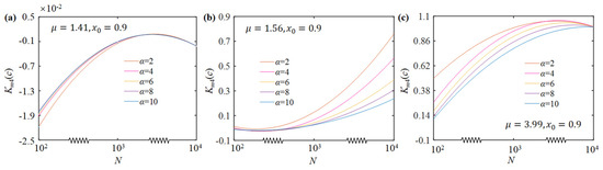 where refers to independently and identically distributed random variable drawn from a uniform distribution on and is related to the noise-level in percent. In practice, it has been reported from Gottwald and Melbourne (2005) and Schreiber and Kantz (1995) that the amount of contaminated data is limited and for large noise levels the Lyapunov exponents are systematically wrong [29,30]. Since the dataset size has a critical impact on the calculation results, the effect of the sequence size on the asymptotic growth rate is discussed, as shown in Figure 3. As expected, the diagnostic output is closer to 0 for periodic motion (e.g., the control parameter is and the initialization is ) and 1 for chaotic motion (e.g., the control parameter is and the initialization is ) when the data length is greater than . In addition, the same pattern also exists for the different values , , , , and of the amplitude parameter. Therefore, it is obvious that the sequence size used in the numerical experiment is related to the results of the 0-1 test for chaos, and the length of the time series used in the numerical investigations is below.