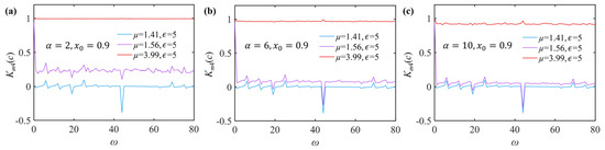As shown in Figure 1a, the bifurcation diagram of the cascade L-C system for different numerical values of control parameter is present. In addition, Figure 1b presents the changing of for the cascade L-C system with increased in increments of 0.05. According to these two subfigures, it is meanwhile observed that the L-C system is chaotic in terms of the most range of , and the asymptotic growth rate gradually approaches by increasing control parameter . The exhibited features in the former subfigure are in perfect agreement with that in the latter one. It is proved that the 0-1 test for chaos can identify the behaviors of the cascade L-C system. Due to the existence of the resonance phenomenon, the asymptotic growth rate drops suddenly from to in some periodic windows. Nonetheless, it is obvious that the cascade L-C system owns an expanded system parameter space, larger regions of chaotic states, and mapping ranges.