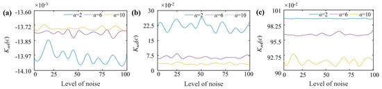 Figure 5 shows the trend of the asymptotic growth rate with the amplitude parameter changing from to when the 0-1 test for chaos is used to identify the status of the noisy cascade dynamical system with different noise-level. According to Figure 5a, the changing trends of the asymptotic growth rate corresponding to the three states, including periodic pattern, weak chaos, and strong chaos, are completely different as the amplitude parameter increases. From Figure 5b, slight fluctuations of AGRs occur for the periodic dynamic. Specifically, for the AGRs there are significant downward trends when , slight rises when and narrow fluctuation around a fixed value which is less than when . From Figure 5c, sharp declines of AGRs occur for the weak-chaotic dynamic, and for the AGRs there are slight and negligible fluctuations around after the amplitude parameter increases to to a first approximation. From Figure 5d, slight declines of AGRs occur for the strong-chaotic dynamics and the values of AGR are all greater than when .