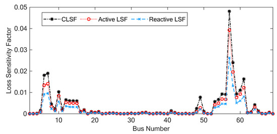 It can be observed from Figure 2 that the buses which have high CPLS values can be defined as candidate buses for DG installation. These candidate buses which comprise up to 50% of the system buses are 57, 58, 7, 6, 61, 60, 10, 59, 55, 56, 12, 13, 14, 54, 15, 53, 8, 64, 49, 11, 9, 17, 65, 16, 5, 48, 21, 19, 41, 63, 68, 34, 20, and 62.