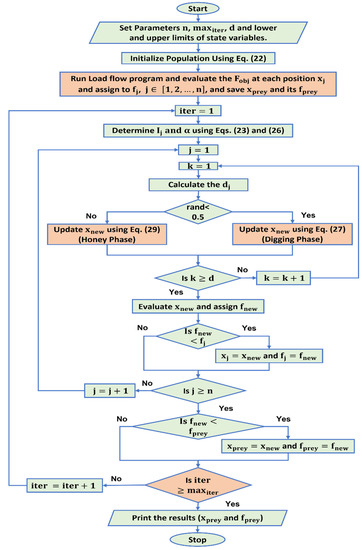 Because of the exploration and exploitation stages, the HBA is considered a global optimization method in theory. The number of operators that must be modified is kept to a minimum to make the HBA simple to implement and comprehend. In general, the HBA mainly depends on three parameters, i.e., the number of state variables , the maximum number of iterations , and the number of populations or the number of solutions. The HBA optimization technique guarantees strong local search ability via honey attraction and guides the individuals in the population to approach the optimal individuals. Furthermore, the density factor achieves the algorithm’s global search capabilities and preserves the divergent population to guarantee that the local optimal solutions are avoided. The pseudocode of the HBA optimization algorithm is represented in Algorithm 1. Figure 5 shows the complete flowchart of the HBA optimization algorithm implemented for specifying the optimal sizing and placement of DGs and CBs in distribution systems.