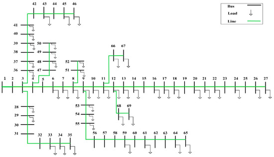 Generally, including DGs in RDS minimizes the system power losses by decreasing the amount of current flowing through the branches; it can also increase the network efficiency by enhancing the voltage profile. Therefore, in this study, the total active power loss was chosen as the optimization structure’s objective function, and it may be calculated as follows: