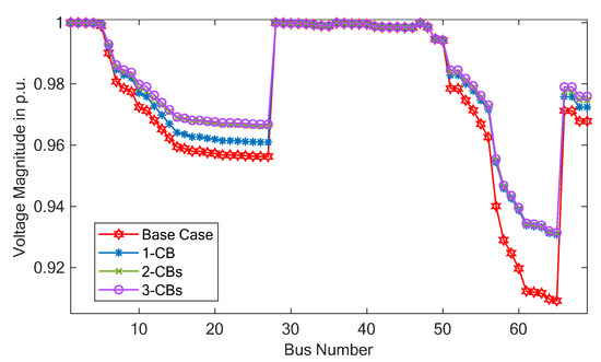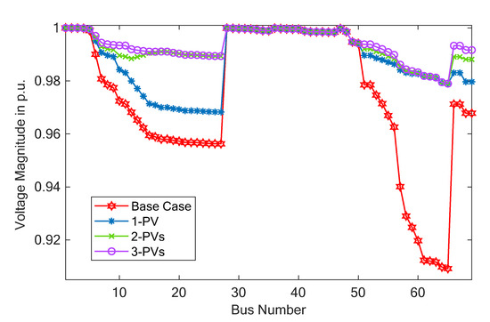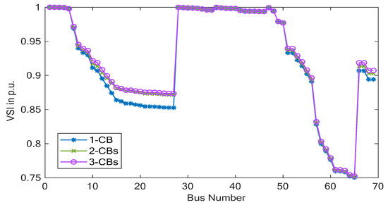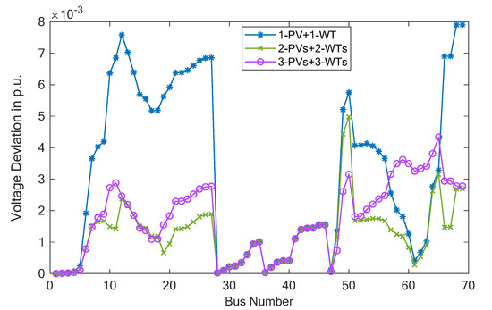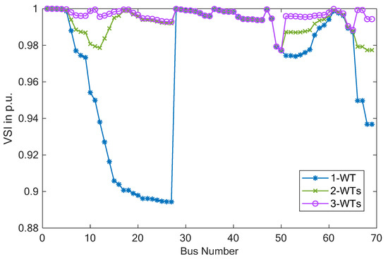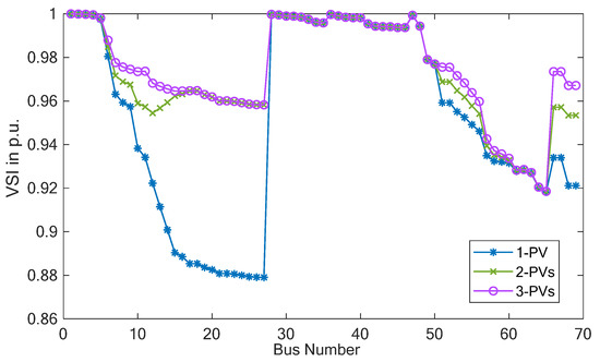 Similarly, as demonstrated in Figure 14, Figure 15 and Figure 16, the DG Type-III has better results than DG Type-I because it supplies apparent power to the RDS. The best location and sizing of one-, two-, and three-DG Type-III decreases the total real losses to 23.1688, 7.2013, and 4.2664 KW, respectively, with percent loss reductions of 89.7, 96.8, and 98.1. This mode of DG integration also enhances the minimum VSI (Figure 14) to 0.8943, 0.9772, and 0.9773, respectively, compared to the base case (0.6833 at bus 64). Regarding the minimum bus voltage profile (Figure 15), a single DG Type-III improves it to 0.97247 found at bus 27, while the two and three units improve the 50th bus voltage profile to 0.99426 and 0.99427 p.u., respectively. When employing a single DG Type-III, the maximum voltage deviation (Figure 16) is improved to 0.0275 (0.0908 at bus 65 for the base case). Nonetheless, the maximum VD at bus 50 is approximately 0.0057 p.u. for both two and three units of DGs Type-III. Consequently, the suggested HBA method gives the best allocation of single and multiple DGs Type-III on RDS compared with other algorithms, as shown in Table 5.