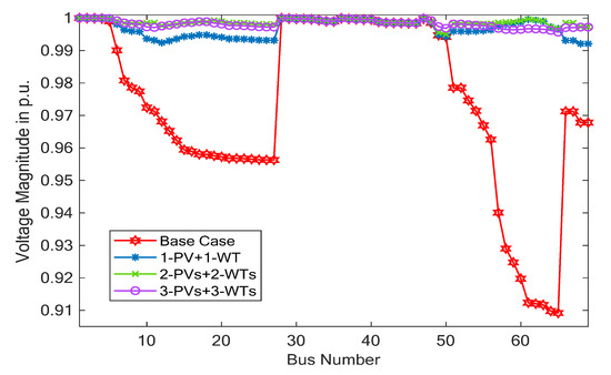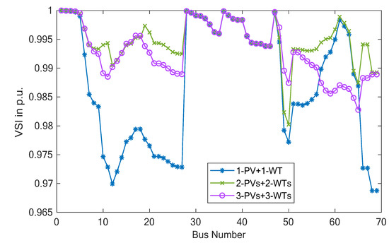 The hybridization of renewable energy sources is a prominent concern. PV and WT are the most common types of renewable distributed generators in RDS. In this scenario, the simultaneous combining of DG Type-I and Type-III on the present test system yielded superior results to the two last scenarios. It can be seen from Table 6 that the optimized simultaneous distribution of one PV with one WT, two PVs with two WTs, and three PVs with three WTs on the distribution network decrease the summation of the line’s power losses to 12.1068, 4.4567, and 3.6741 KW, respectively. This type of DG integration increases the voltage stability index at all buses, as shown in Figure 17, and decreases the bus voltage deviation as depicted in Figure 18. From Figure 19, it also improves the voltage profile, where the minimum voltage is found at bus 69 (i.e., 0.9921 p.u.) for one PV with one WT, and bus 50 and 65 (0.9950 p.u., and 0.9968 p.u., respectively) for two PVs with two WTs and three PVs with three WTs, respectively. As a result, compared to the EA-OPF algorithm, the HBA method provides the optimal simultaneous distribution of the DG based on Type-I with Type-III on RDS, as depicted in Table 6.