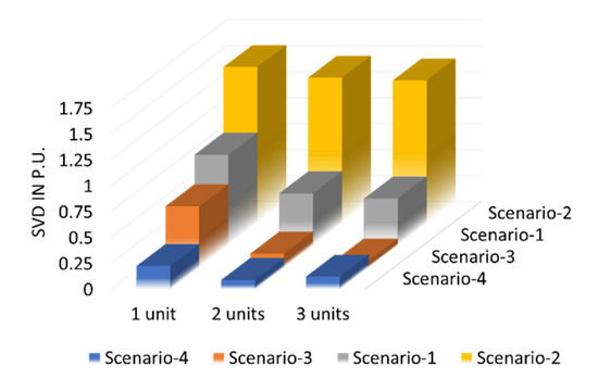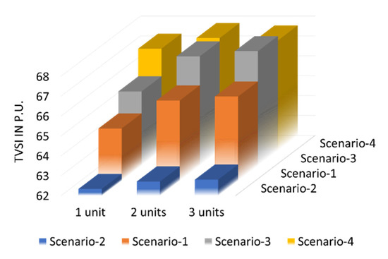 As discussed in the previous section, the HBA provides the optimal allocation of single and multiple DGs and capacitors on IEEE 69-bus RDS. Figure 20 illustrates the total active power loss obtained using the suggested HBA for the four test scenarios. It can be seen from this figure that the HBA gives the best solution in all test cases. Regarding the summation of voltage deviation (SVD) (shown in Figure 21), the three units of DG Type-III give the minimum SVD, while the maximum SVD is obtained using one capacitor. Figure 22 shows the total voltage stability index for the HBA on IEEE 69-bus RDS in different scenarios. This figure proves that the proposed algorithm increases the TVSI for the studied cases.