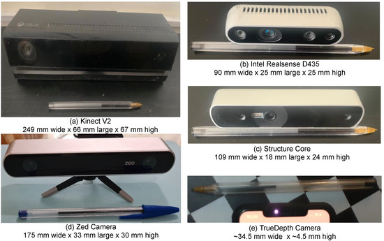 RBB-D cameras, (a) Kinect, (b) Realsense D435, (c) StructureCore, (d) Zed Camera, (e) TrueDepth Camera.