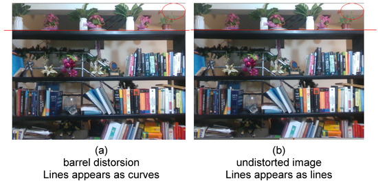 Barrel distortion appears at the left of the image. The main characteristic of this type of distortion is straight lines appearing as curves with the outer side from the center to the edges of the image (a). On the right side (b), the same scene image after an undistortion correction [31].