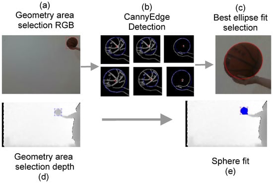 Proposed methodology. A minimun of five different pair images color-depth (a–e) are required to find ellipses and sphere centers.