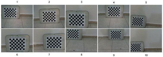 The proposed methodology requires undistorting the RGB image layer using the Zhang calibration strategy [43]. For this purpose, a set of at least 10 color images where a chessboard is visible needs to be sampled using RGB-D camera, as shown in Figure 7, we use a public toolbox available from [44] based in [45] to get a intrinsic matrix and undistortion coefficients.