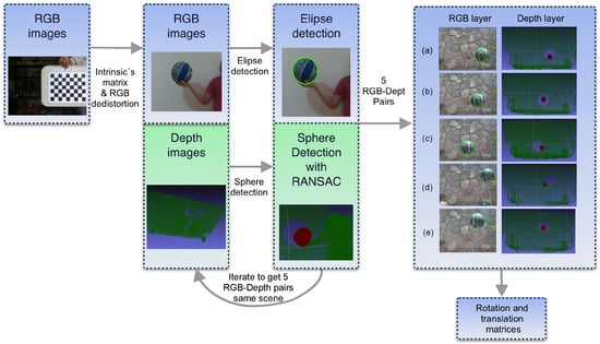 In phase four in Figure 8, having five pairs of ellipse centers and sphere centers, Quest method is incorporated into our methodology to find the rotation and translation matrices. This method has better accuracy in the presence of noise and allows us to use a minimum number of samples in the calibration protocol [41]. Furthermore, Quest method has been used to find rotation and translation from a pair of different views of the same scene with an RGB image and a depth image. Each layer requires its intrinsic matrix, and sphere centers in the depth layer were de-projected to a euclidean space with the intrinsic matrix of the depth layer, as the Quest method implementation needs to work with the same camera. A second alternative is to de-project world coordinate sphere centers, created from the depth layer in a 3D cloud, to a virtual view with the same RGB intrinsic matrix.