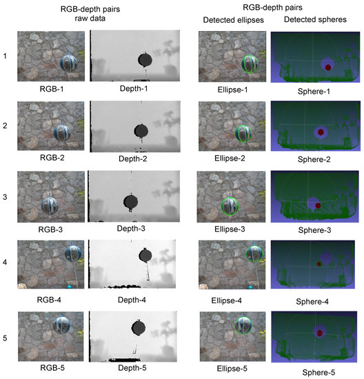 Five pairs of RGB (color) and depth raw images are showed at the left of the Figure 9, then these are processed to get ellipses from the color layer and spheres from the depth layer. As a final result of this phase, we get five correspondences from ellipse centers to spheres centers.