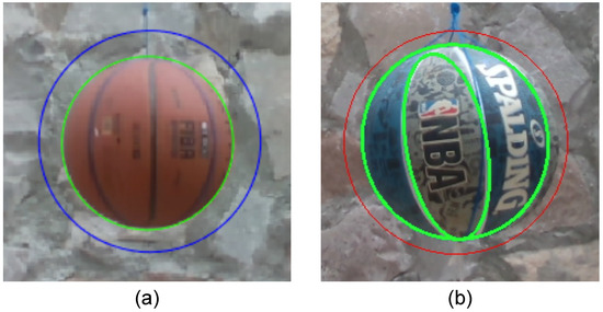 Projection result of the detected sphere using [42] in blue color (a); projection result with our proposed method (b).