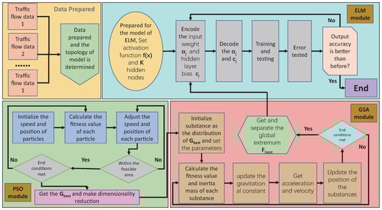 In this section, an extreme learning machine is applied to establish the traffic flow forecasting model first. Then, particle swarm optimization is employed for determining the parameters of the gravitational search algorithm. Later, the resulting PSOGSA hybrid module is used to optimize the extreme learning machine.