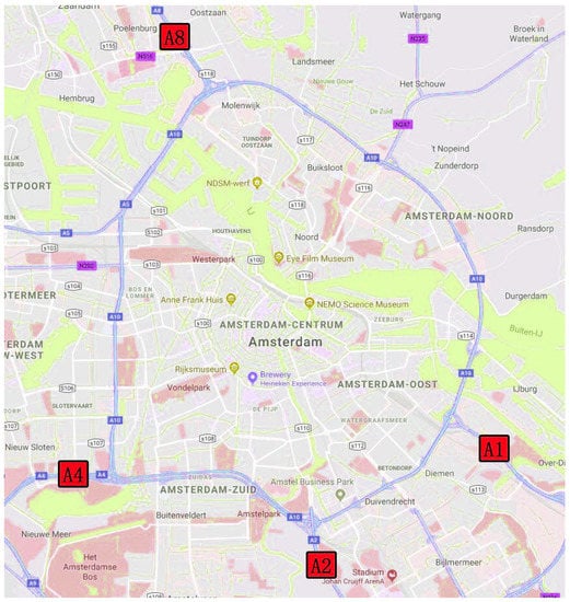In this section, four benchmark traffic datasets are employed for appraising the PSOGSA-ELM model. Wang et al. [] collect these datasets from four freeways A1, A2, A4, and A8, which end at Amsterdam A10 Ring Road. MONICA loop detectors are employed for collecting these datasets from 20 May to 24 June 2010, and the detection location is demonstrated in Figure 3.