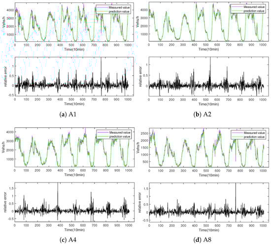 In Figure 4a–d, the deviation between the short-term traffic flow predicted values of the model and the practical measured values are visualized intuitively. The purple lines demonstrate the measured values, whereas the green lines represent the predicted values. The errors between the predicted value and measured value divided by the ground truth, termed the relative error of the model, are plotted with a black line. In Figure 4, we can find the related errors calculated by experiments approached 0 most of the time, which proved the outstanding performance of the PSOGSA-ELM model in the scenes of A1, A2, A4, and A8.
