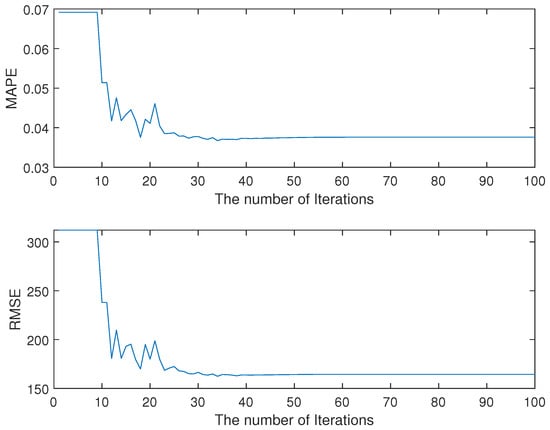 The change trends of MAPE and RMSE with the number of iterations of GSA.