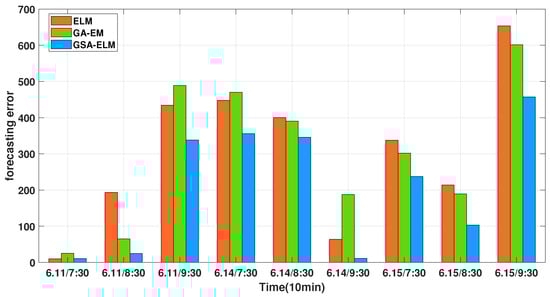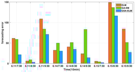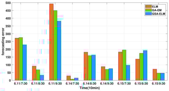 The forecasting errors during the morning peak period while optimizing ELM with different optimization algorithms.