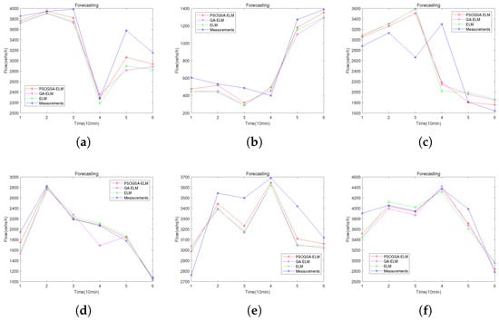 Under the conditions of large traffic flow fluctuations, the forecasting performance of different algorithms optimized ELM is shown as (a–f).