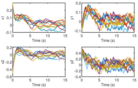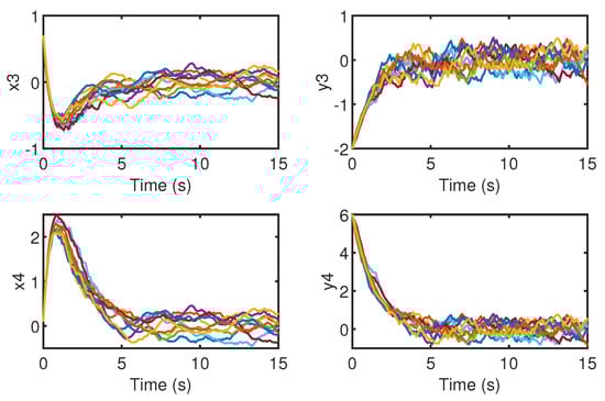 From Figure 1 and Figure 2, we can observe that all the subsystems of RCON (11) states are bounded when the random process meets with being a positive constant, condition P1 in Theorem 2 is satisfied and coupling configuration matrix of RCON (11) is irreducible, which brings into correspondence with the conclusion above and further shows the practicability of the results presented in the paper.