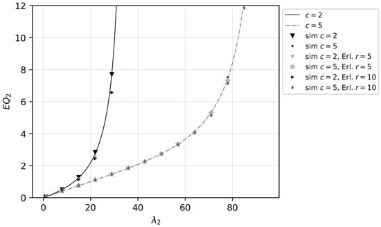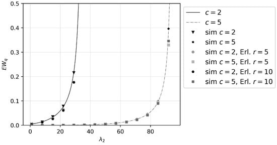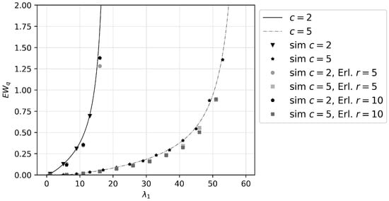 Figure 2 and Figure 3 compare the average waiting times of class-2 customers as and c vary. It can be seen that the average amount of time that class-2 customers spend in the system () is larger when customers of either class arrive more frequently or when there are fewer servers. We observe that with exponential service time distribution for class-1 is largest while with is larger than that with . This indicates that increases with the increase in the variance of service time of class-1 customers.