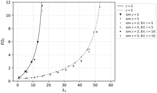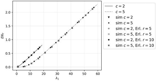 Figure 6 illustrates how the average number of termination events per class-2 customer () changes according to the arrival rates of class-1 customers and the number of servers. Obviously, when class-1 customers arrive more frequently, more class-2 customers’ sessions are terminated. In addition, as the number of servers is larger, there are more spaces for all customers, and thus, class-2 customers are less likely to be kicked out of the servers. The same patterns can be observed in Figure 7. Furthermore, simulations results for the Erlang service time distributions of class-1 customers are almost the same as the corresponding ones with exponential distributions. This shows that is (almost) insensitive to the service time distribution of class-1 customers.