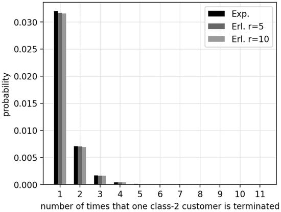 Figure 8 shows the distributions of the number of times that each class-2 customer is terminated. In this experiment, we set , and let the service time of class-1 customers follow an exponential distribution (denoted by in the figure) and Erlang (Erl) distributions. It can be seen that higher numbers of termination times occur with smaller probabilities. In addition, there is no significant difference in the results when we modify the distribution of service time for class-1 customers under the three settings.