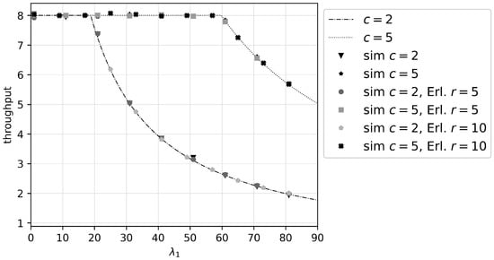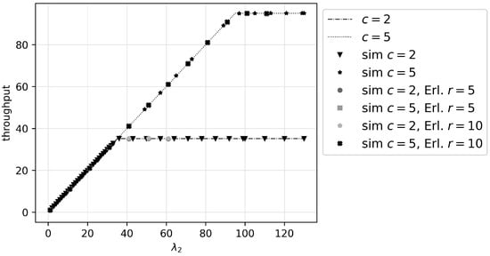 Figure 9 reflects changes in the throughput of class-2 customers against when is fixed. It can be seen that the throughput values remain unchanged at when goes up to certain thresholds; then, they drop as continues to increase. Meanwhile, Figure 10 indicates that the throughput is equal to up to a certain threshold of ; then, it remains unchanged at a value when class-2 customers arrive at very high rates. At that, equals the right-hand side of the stability condition (34).