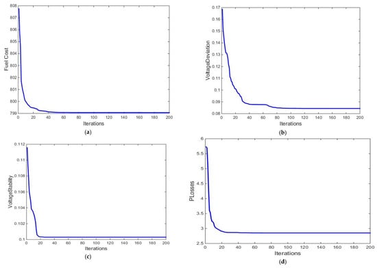 Table 4 shows the simulation results reported for these cases using the proposed TFWO algorithm. In Case 10, three objectives, fuel costs, voltage deviation, and power losses are optimized simultaneously. In Case 11, the triple function aims at minimizing the fuel costs, the power losses and the emission level, while Case 12 optimizes the fuel costs, the voltage deviation, and the emission level simultaneously.