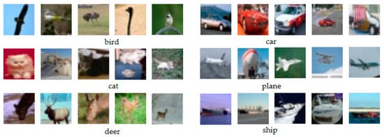 As shown in Figure 1, the CIFAR-10 database involves 10 different classes, including birds, deer, cats, automobiles, airplanes, etc., all of which are 32 × 32 RGB, 60,000 pictures in total. The database is used to verify the ability of the BNDDH algorithm to classify the common coarse-grained label data in real life.