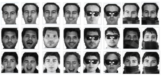 The accuracy of facial recognition in the real world will be affected by expression, occlusion, and lighting conditions. The AR face database is used to verify the robustness of the proposed algorithm. As shown in Figure 4, the database contains 120 people, each with 26 pictures. The size of each picture is 50 × 40 pixels.