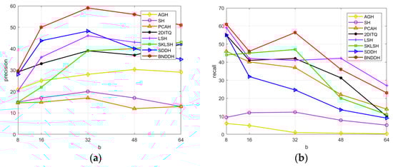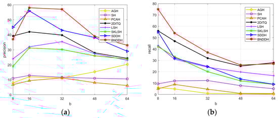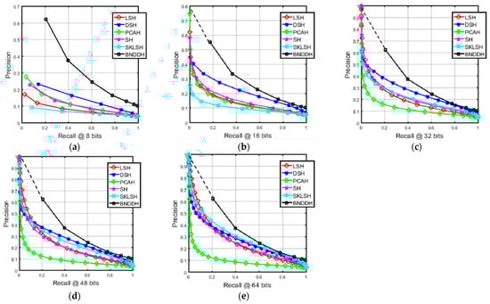 In this part, we test the proposed algorithm on the CIFAR-10 database. Inspired by reference [8], we extract the depth two-dimensional features of the CIFAR-10 database and extract the image features by a Convolutional Neural Network (CNN) [33]. The two-dimensional AlexConv5 feature (256 × 36) is used to replace the original 32 × 32 RGB image in the experiment. This paper selects 10,000 data as the training set and 1000 data as the test sample. The precision–recall curve of the experiment is shown in Figure 5 below. The BNDDH algorithm shows good performance on different hash bits. Although the hash code is short, the BNDDH algorithm is still better than other comparative hashing algorithms.