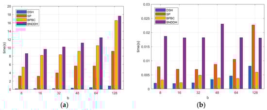 We choose an unsupervised algorithm with relatively good MAP and the BNDDH algorithm to analyze the running time. The training time and testing time are shown in Figure 8. It can be seen that the training time of all algorithms increases with the increase in hash code. The training time of the DSH algorithm is the shortest, probably because the method is relatively simple. The DSH algorithm uses K-means to partition data, and learns projection vectors through the geometric structure of the data to obtain hash codes. The training time of the BNDDH algorithm is similar to that of another unsupervised bilinear projection BPBC algorithm, but the testing time of BNDDH is relatively long.