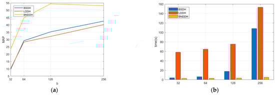 In order to reconcile the computational efficiency and performance of the BNDDH algorithm, we compare the relationship between size and of the projected characteristic matrix and the value of MAP under different hash bits. Since the size of the AlexConv5 feature of CIFAR-10 is 36 × 256, the experimental setting is much smaller than . Theoretically, we hope to learn the optimal hash code when and are as small as possible. The smaller and indicate the lower complexity of the algorithm, but the MAP value of the algorithm is often lower. As can be seen from Figure 11a,e, the MAP increases with the increase in and , but when the value of is greater than 16 and the value of is greater than 48, the MAP is basically stable. In practical application, it is quite straightforward to find such critical values to ensure that learning is better.