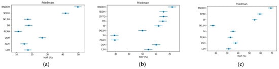 In order to more intuitively represent the performance of each algorithm, we conducted a Friedman test and Nemenyi post-hoc test on three databases, respectively, and the results are shown in Figure 10. is the critical threshold, where represents the number of all hashing algorithms and represents the number of different hash codes. The test level of 0.05, so we can achieve and . For each algorithm, dots represent the average value of the MAP in different hash codes, and the length of the horizontal line represents the value of critical threshold , so we achieve and .