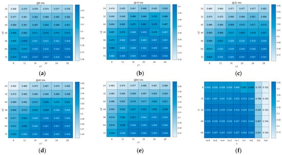 The heatmap of parameter selection experiments on the CIFAR-10 database. The MAP changes with and when: (a) hash bits equal 8; (b) hash bits equal 16; (c) hash bits equal 32; (d) hash bits equal 48; (e) hash bits equal 64. (f) The MAP changes with on different hash bits.