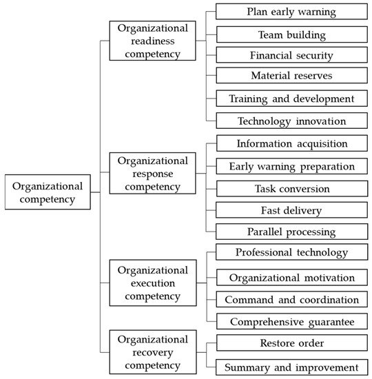 After two rounds of Delphi Method feedback, the competency assessment indicator database for full-time water conservancy emergency rescue teams was formed. Then, the final seventy-seven assessment indicators were processed by stratification, and the second- and third-level assessment indicators of the competency assessment indicator system were determined. Then, according to the life-cycle approach, the first-level assessment indicators were established for the competency assessment of water conservancy full-time emergency rescue teams; these indicators were organizational readiness competency, organizational response competency, organizational execution competency and organizational recovery competency. The first- and second-level assessment indicators are shown in Figure 1; , , and represent the first-, second- and third-level assessment indicators, respectively. Combined with the characteristics of the full-time water conservancy emergency rescue team and the requirements of emergency management construction, the competency assessment indicator system and spiral organizational competency model of the full-time water conservancy emergency rescue team were constructed, as shown in Table A4 (see the Appendix A) and Figure 2.