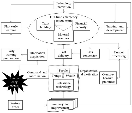 In the process of further promoting the emergency management of water availability, China still faces certain problems. Natural risks such as floods have increased, prevention and control have become more difficult, and emergencies are prone to occur. The COVID-19 epidemic and the “July 20” Catastrophic Rainstorm Disaster in Zhengzhou, Henan Province in 2021 are examples of this. Therefore, as the final barrier to for preventing and controlling major risks, emergency rescue is of great importance to resist disasters, reduce losses and protect lives. China’s emergency rescue teams are mainly composed of full-time, military and part-time emergency rescue teams [1,2]. Among these, full-time emergency rescue teams, including comprehensive fire rescue teams and various professional emergency rescue teams, are responsible for risk prevention, response and emergency rescue during various natural disasters and accidents [3]. The full-time water conservancy emergency rescue team is one of the key forces in charge of flood and drought control.