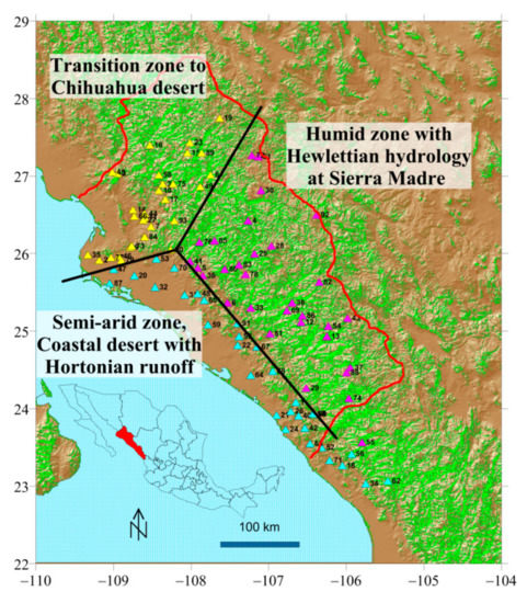 How can the most appropriate regionalization be identified? The work presented by Drescroix et al. (2007) [54] to attempt to define the spatial and temporal boundaries of Hortonian (infiltration excess runoff) and Hewlettian (saturation excess overland flow) hydrological behavior found the most functional regionalization for northern Mexico. This study is based on data collected in four diverse areas of northern Mexico. The experimental sites were equipped with stream gauges and rain gauges. This study determined that the Sierra Madre is mostly characterized by a humid zone with Hewlettian hydrology. Another zone with Hortonian runoff completely dominates the semi-arid and arid areas. However, in certain areas saturation excess overland flow can appear due to the genuine possibility of the landscape infiltrating a significant proportion of rainwater, i.e., during hurricanes crossing the mountains. It has been shown that the relationship between a soil’s classification and the spatial parameters of a conceptual catchment scale is very important in the hydrological models [55]. This region would represent a coastal and mountainous area, identified as the transition zone to the Chihuahua Desert. This zone can be evidenced clearly in the regionalization work proposed therein (Figure 2). In detail, it can be remarked that each region maintains extremely specific characteristics, described below and in Appendix A.