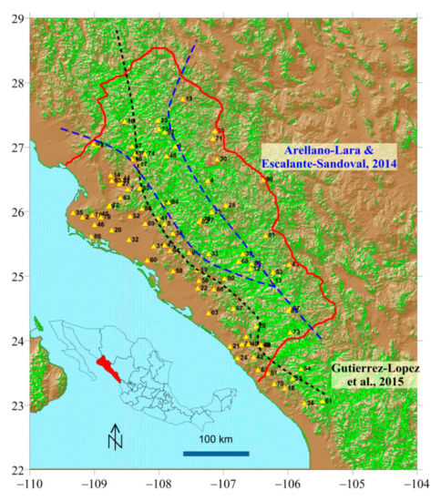 | Gutierrez et al. (2015) [1] | Cartography of [53] | Two regions: one on the Sierra Madre and the other on the coastal flat-plain (Figure 3). |
