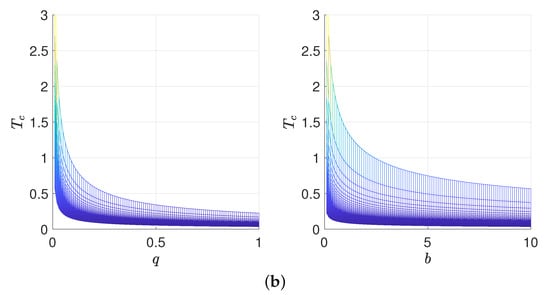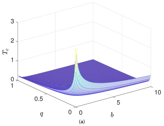The relationship between the critical temperature , the charge q and the parameter b: (a) -q-b relationship diagram, (b) -q and -b relationship diagrams.