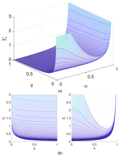 The relationship between the critical temperature , the charge q and the dilaton parameter : (a) -q- relationship diagram, (b) -q and - relationship diagrams.