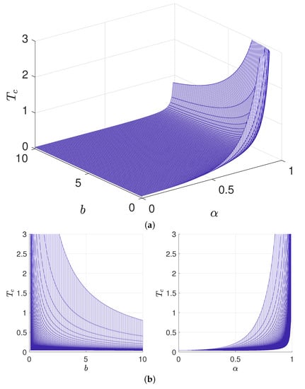 The relationship between the critical temperature , the dilaton parameter and the parameter b: (a) -b- relationship diagram, (b) -b and - relationship diagrams.
