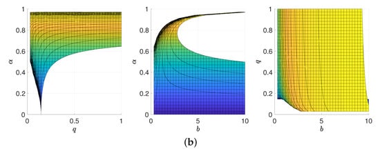 The relationship between the charge q, the dilaton parameter and the parameter b when the critical temperature : (a) -q-b relationship diagram, (b) -q, -b and q-b relationship diagrams.