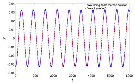 Comparison between the two-timing scale method solution and the “exact solution” for , , , , , and .