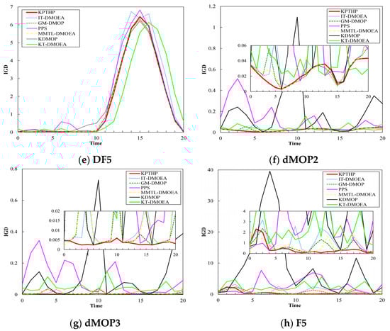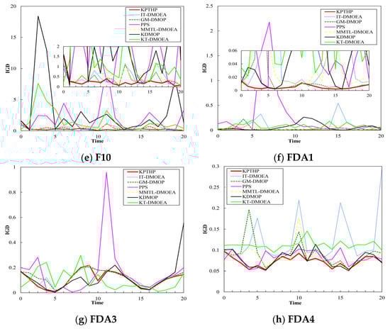 Figure 6 show the IGD variation curves for all the tested functions. It can be visually observed that KPTHP has outstanding performance in most of the tested functions, which indicates that KPTHP is more able to cope with the effects of environmental changes. From the figures, we can see that KDMOP often has IGD peaks in some test problems, such as dMOP2, dMOP3, F6, and F10, which indicates the instability of this algorithm in the evolutionary process. The possible reasons for this occurrence are the drastic nature of POF change and the nonlinear correlation, which can cause errors in the predicted direction. On FDA4 and F8, IT-DMOEA does not perform satisfactorily, probably because the guided population based on the reference vector does not behave well in three-objective problems.