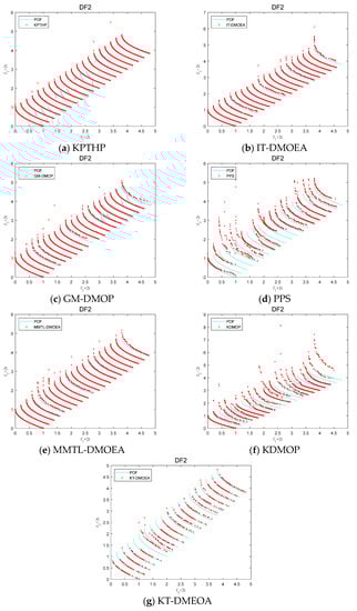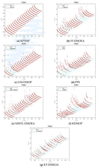 Above, we analyzed the performance of the algorithm running on the test functions under the four metrics. In the following, we present a visualization of the excellent performance of the algorithm, including the IGD evolution curves of the sixteen functions at different moments and the POFs of FDA1, dMOP2, and DF2 obtained by the seven algorithms. The change frequency τt and change severity nt of all the algorithms are fixed to (5, 20).
