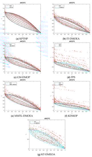 Table 4, it can be observed that KPTHP has a better performance than the other six algorithms in many of the tested functions, and especially in MMS indicator is completely superior to them. In the remaining six algorithms, PPS utilizes substantial prime points to train the AR model, but in effect, there are simply not enough high-quality prime points to support accurate predictions at this early stage of evolution, rendering performance incompetent. IT-DMOEA, MMTL-DMOEA, and KT-DMOEA are based on transfer learning methods. Although they reduce the occurrence of negative transfer to some extent, the quality of transferred individuals is inferior to KPTHP. KDMOP mainly predicts individuals depending on the direction of point evolution, and consequently, there is not much superiority in the test functions where POF changes frequently. The performance of the algorithms is further analyzed as follows according to the characteristics of the test functions.