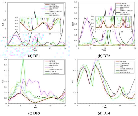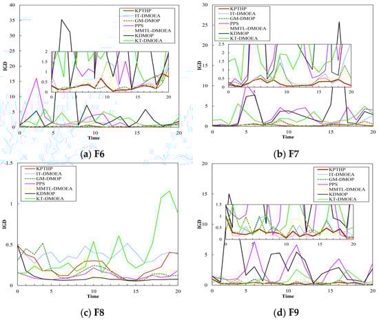 From Table 9, we can obviously notice that the performance of KPTHP is significantly better than the other two versions, which suggests that each component of KPTHP has an indispensable influence. Comparing KPTHP and KPTHP-v1, we can find that the MIGD value of the former is significantly smaller than that of the latter, which indicates that feed-forward prediction can improve the convergence of the algorithm to a certain extent. Then, comparing KPTHP and KPTHP-v2, KPTHP is smaller than KPTHP-v2 for the majority of test functions with HVD and MMS values, which implies that the transfer based on key points can improve the distribution and diversity of the algorithm. In summary, given the preceding analysis, it is concluded that each component is significant and essential when dealing with dynamic environments.