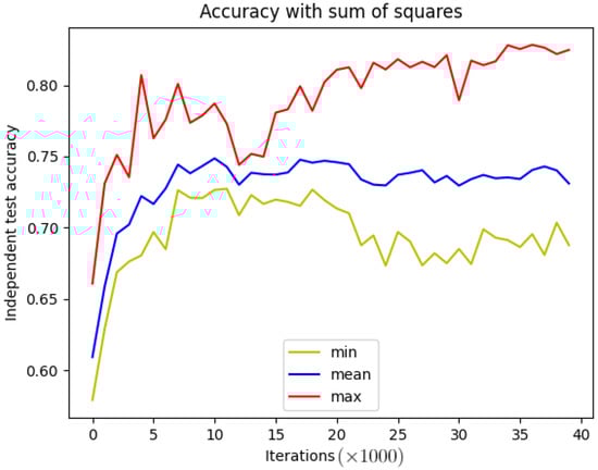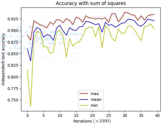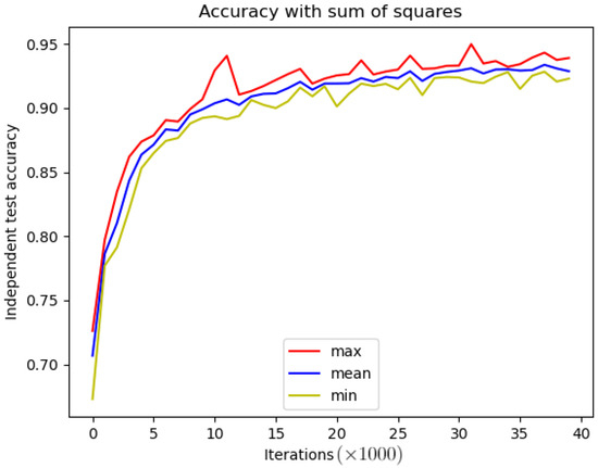 Five training results of MNIST classification in frequency domain with the proposed nonlinear activation function, with square sum instead of inverse FFT. The red color means the maximum accuracy, the blue line shows the mean accuracy and the yellow color is the minimum accuracy.