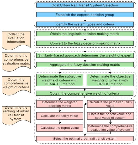 In the past few decades, researchers have proposed many new methods to deal with MCDM problems in real life, such as TOPSIS, VIKOR, MABAC, COPRAS and so on. COPRAS is an MCDM method proposed by Zavadskas et al. [29] in 1994. This method can effectively evaluate the scheme step by step in combination with the importance and effectiveness of the evaluation criteria to obtain the best scheme. It has the characteristics of wide application range and good evaluation effect [30]. The COPRAS method is also widely used. For example, Büyüközkan and Göçer [31] combine AHP and COPRAS to select the best digital supply chain partner. Balali et al. [32] used ANP and COPRAS to rank the effective risks of human resource threats in natural gas supply projects. Mishra et al. [33] and Alipour et al. [34] proposed the combination of SWARA and COPRAS for the sustainability evaluation of the bioenergy production process and the selection of fuel cell and hydrogen component suppliers, respectively. Yuan et al. [35] and Narayanamoorty et al. [36], respectively, used DEMATEL and COPRAS to evaluate and select the third-party logistics suppliers and the best alternative fuel, but both of them only used the subjective weight determination method to determine the attribute weight. In addition, although the methodological framework proposed by many scholars takes into account the regret theory, there are, however, no studies combining regret theory with the COPRAS method to provide decision support for the selection of an urban rail transit system.